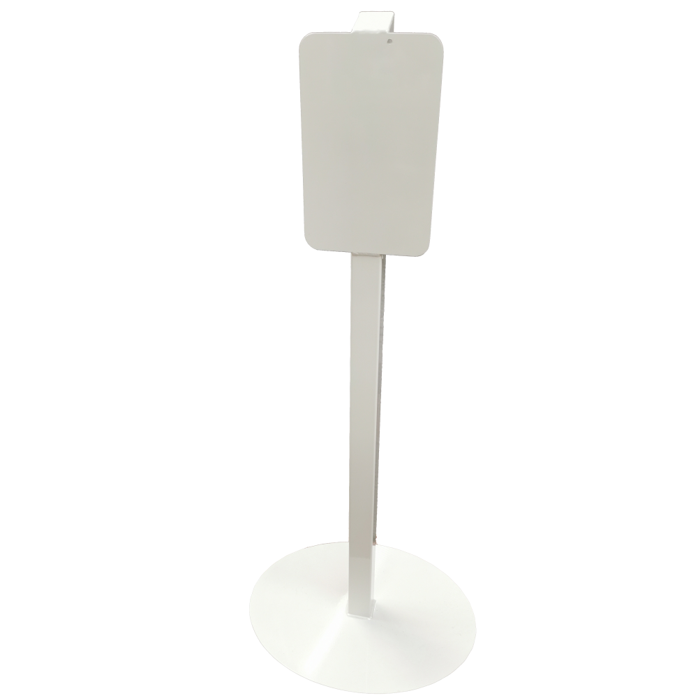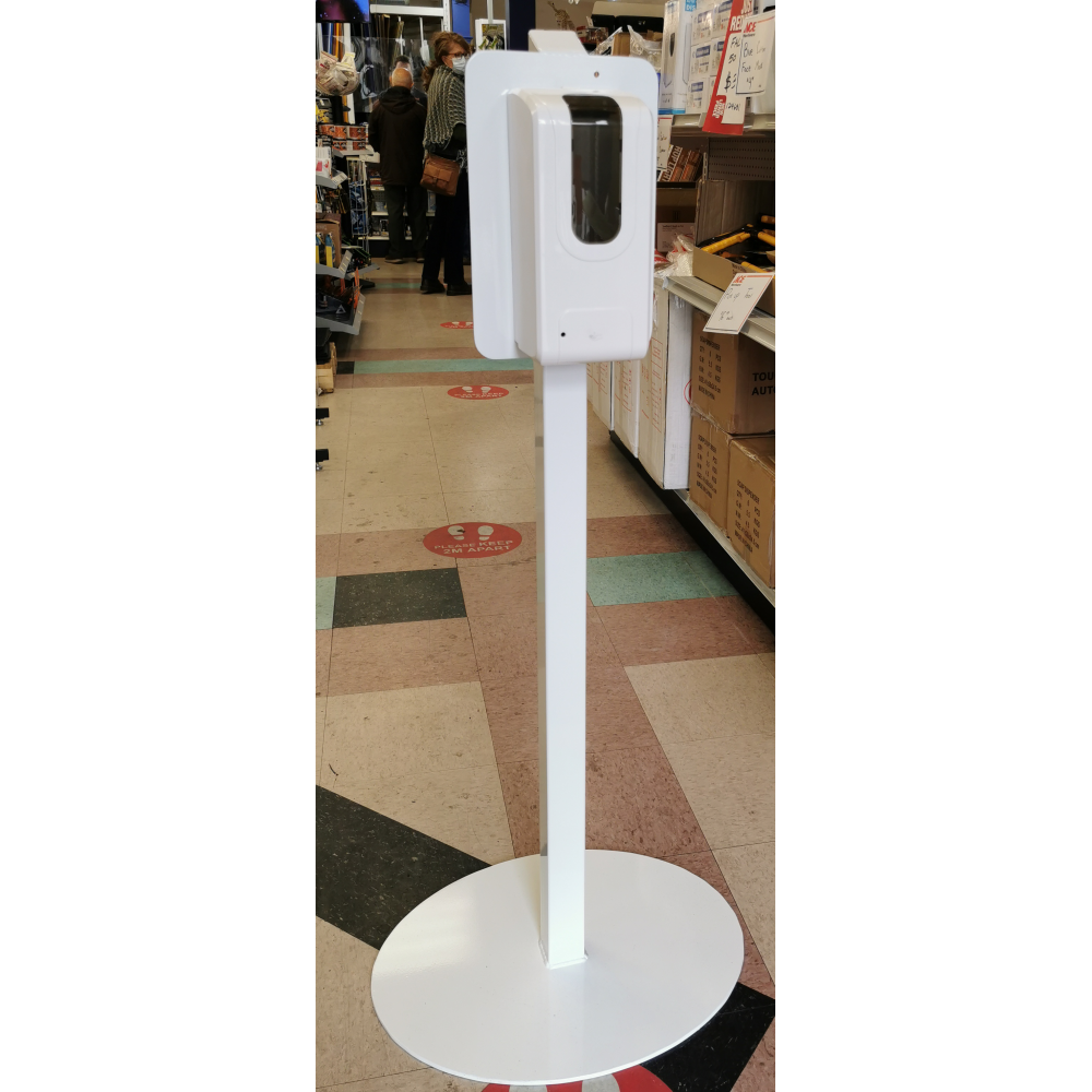 All steel construction with a high gloss powder coated finish this stand alone holder comes ready to mount our wall mount Hands Free Sanitizer station.  Choose the full package option and get a Hands Free Dispenser, 4 C Batteries and 2 litres of Gel Sanitizer to fill the Dispenser. and Save Big