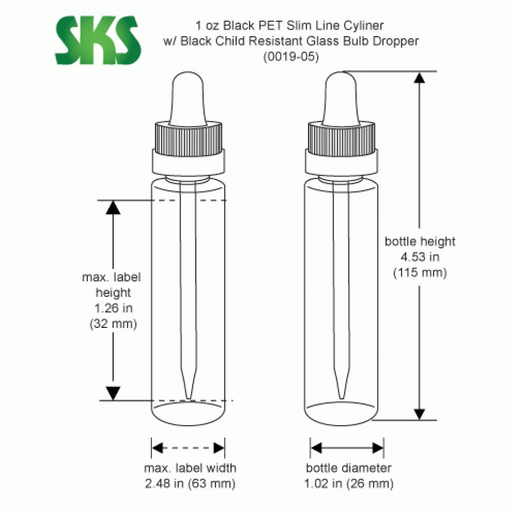 Black slim line cylinder bottles are paired with black child resistant glass droppers for various applications which can include pharmaceuticals and E-liquids. To remove the child resistant bulb glass droppers while pressing down, you will turn the caps in the direction of the arrow printed onto the caps. These black PET slim line cylinders are opaque, meaning they will provide an extra UV barrier while maintaining all the beneficial properties of PET as a packaging choice.