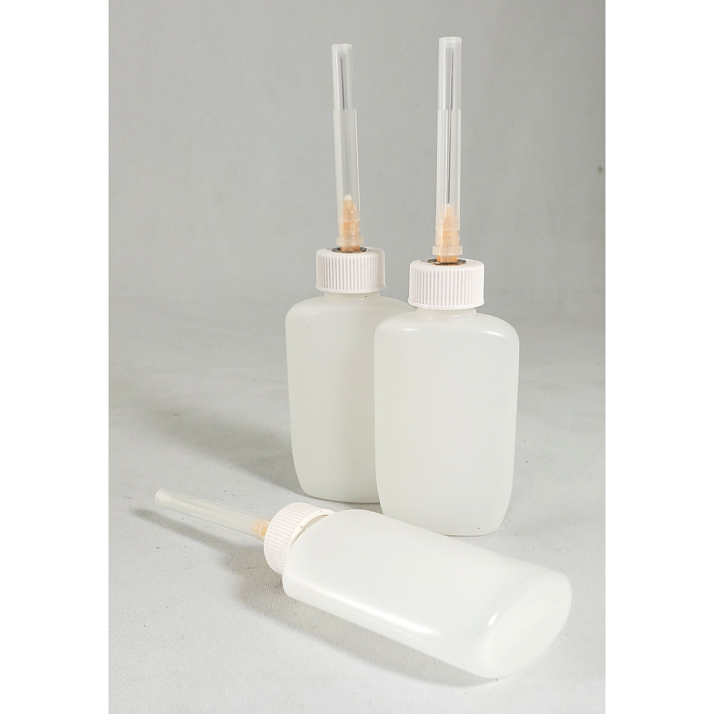 A long needle applicator for solvent cement. A light squeeze of the bottle will start the flow so you can control the amount of solvent applied.