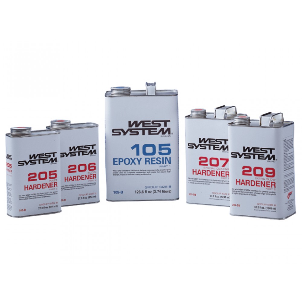 205 Fast Hardener is a medium-viscosity epoxy curing agent. It is used in a majority of situations, at lower temperatures and to produce a rapid cure that develops its physical properties quickly at room temperature. When mixed with the 105 Resin in a five-part resin to one-part hardener ratio, the cured resin/hardener mixture yields a rigid, high-strength, moisture-resistant solid with excellent bonding and coating properties. Not intended for clear coating.