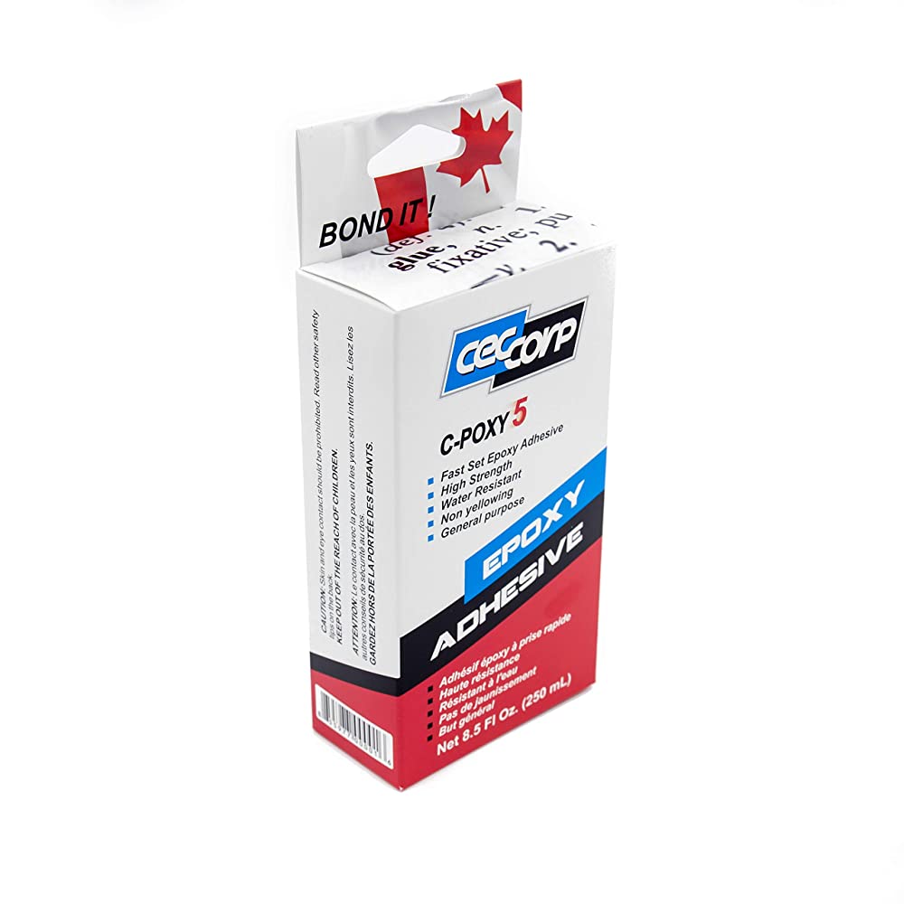 Two Part 5 Minute Epoxy Adhesive C-Poxy 5 by CECCORP is a 250 mL general purpose structural-unfilled-fast setting epoxy glue. Recommended for bonding metals, ceramics, stone, glass, concrete, wood, fiberglass and many plastics such as polyester, ABS, rigid PVC (not suitable for PTFE-PP-PE and rubbers).