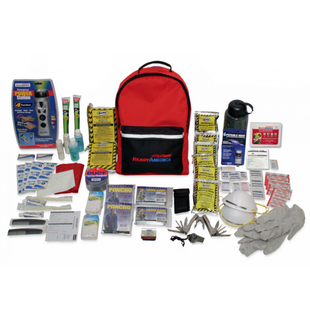 The three basic essentials, as recommended by the American Red Cross, are in every handy backpack. Store it wherever it can be easily accessed in an emergency.