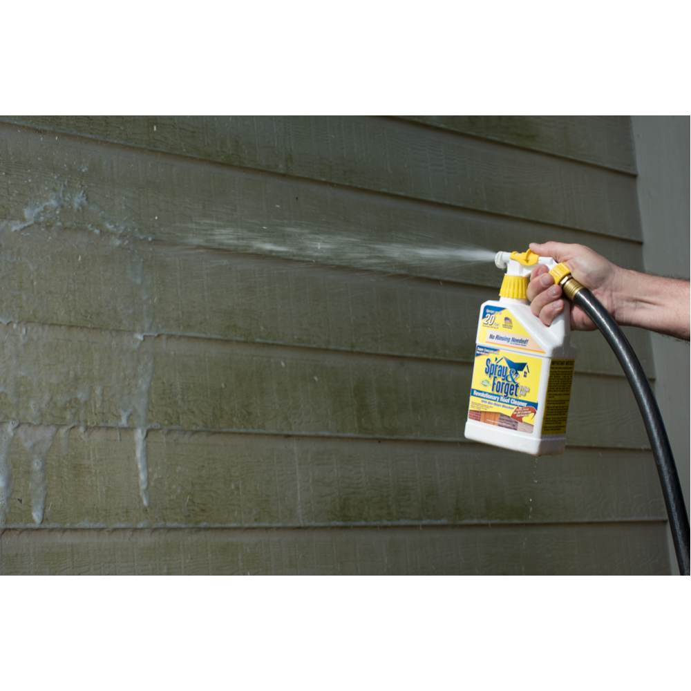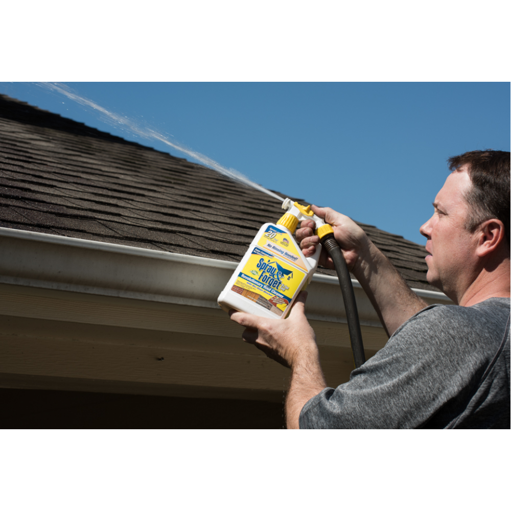 Treats 1200 to 2000 Sq. Ft. Our revolutionary patent-pending, "No Rinse" concentrated cleaner that removes green and black stains caused by algae, mold, moss, and lichen from all roof types, siding, decks, brick, stucco, and other exterior surfaces. Spray & Forget is an eco-friendly, biodegradable, non-corrosive, non-caustic, non-acidic product that does not require damaging power washing and/or brushing techniques. In fact, no rinsing is required and your landscaping will not be compromised. Also an excellent preventative!